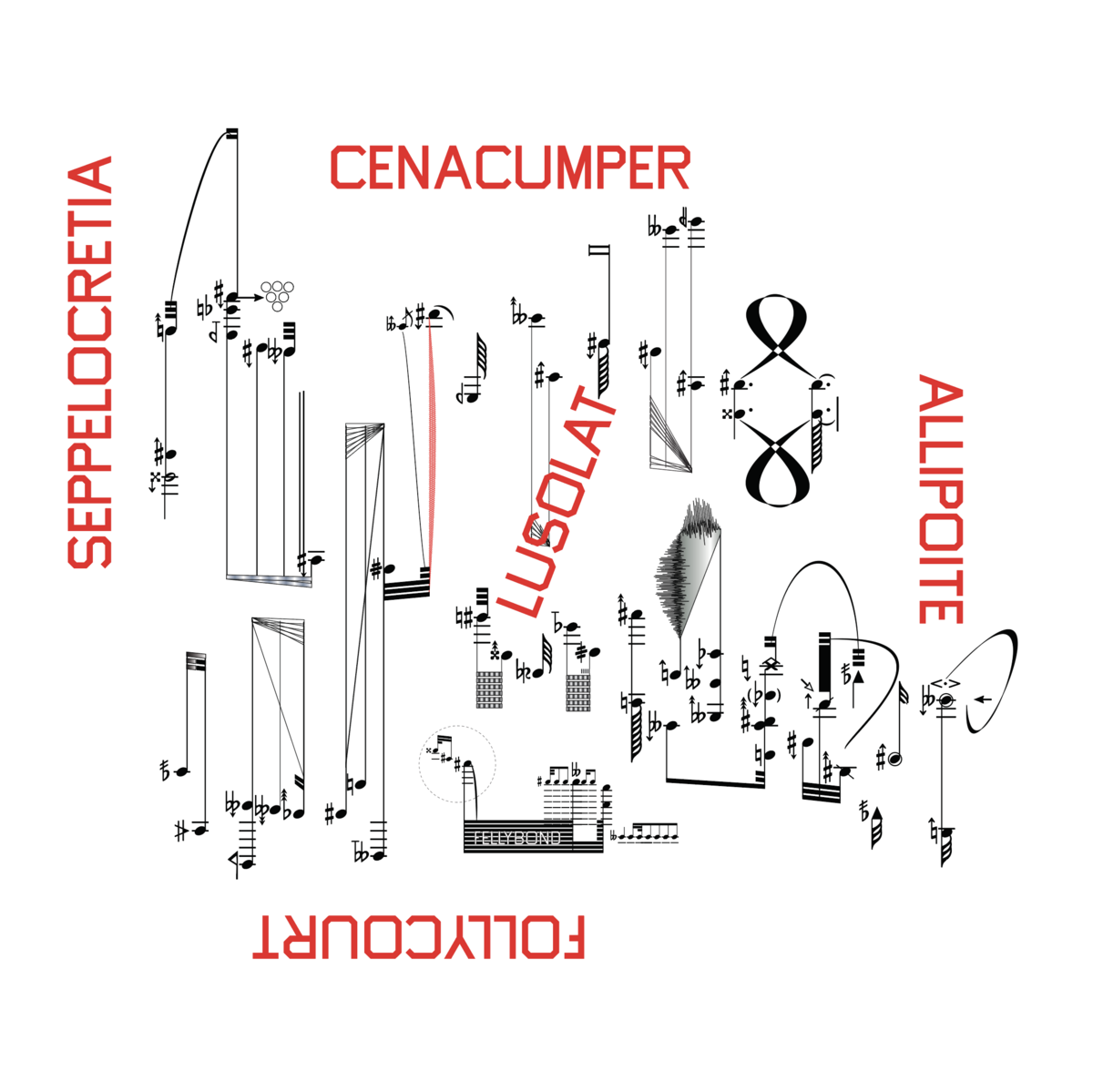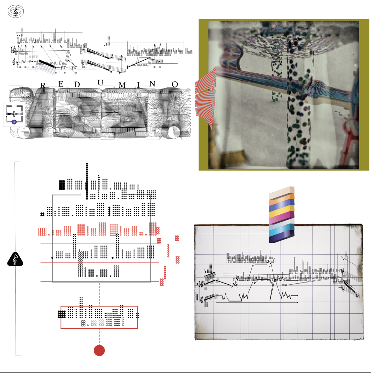 Score pages that fuse traditional + non-traditional notation, symbols, margin codes